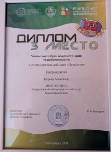 С 31 марта по 04 апреля в Красноярском краевом Дворце пионеров проходил Чемпионат Красноярского края по робототехнике 2026. Чемпионат является отборочным этапом всероссийских конкурсных мероприятий в области робототехники. В этом году в 19 видах состязаний приняли участие 300 школьников края от 7 до 18 лет. Команда Детско-юношеского центра «Техноград», представлявшая Северо-Енисейский округ, приложила массу усилий в захватывающей борьбе с многочисленными и достойными соперниками из региона в категории «Эстафета». Нашим ребятам Кирееву Александру и Золотухину Глебу удалось вырваться в тройку лидеров. Поздравляем команду и ее педагога Зукол Елену Валерьевну с успешным выступлением на чемпионате и надеемся на новые достижения будущих инженеров.